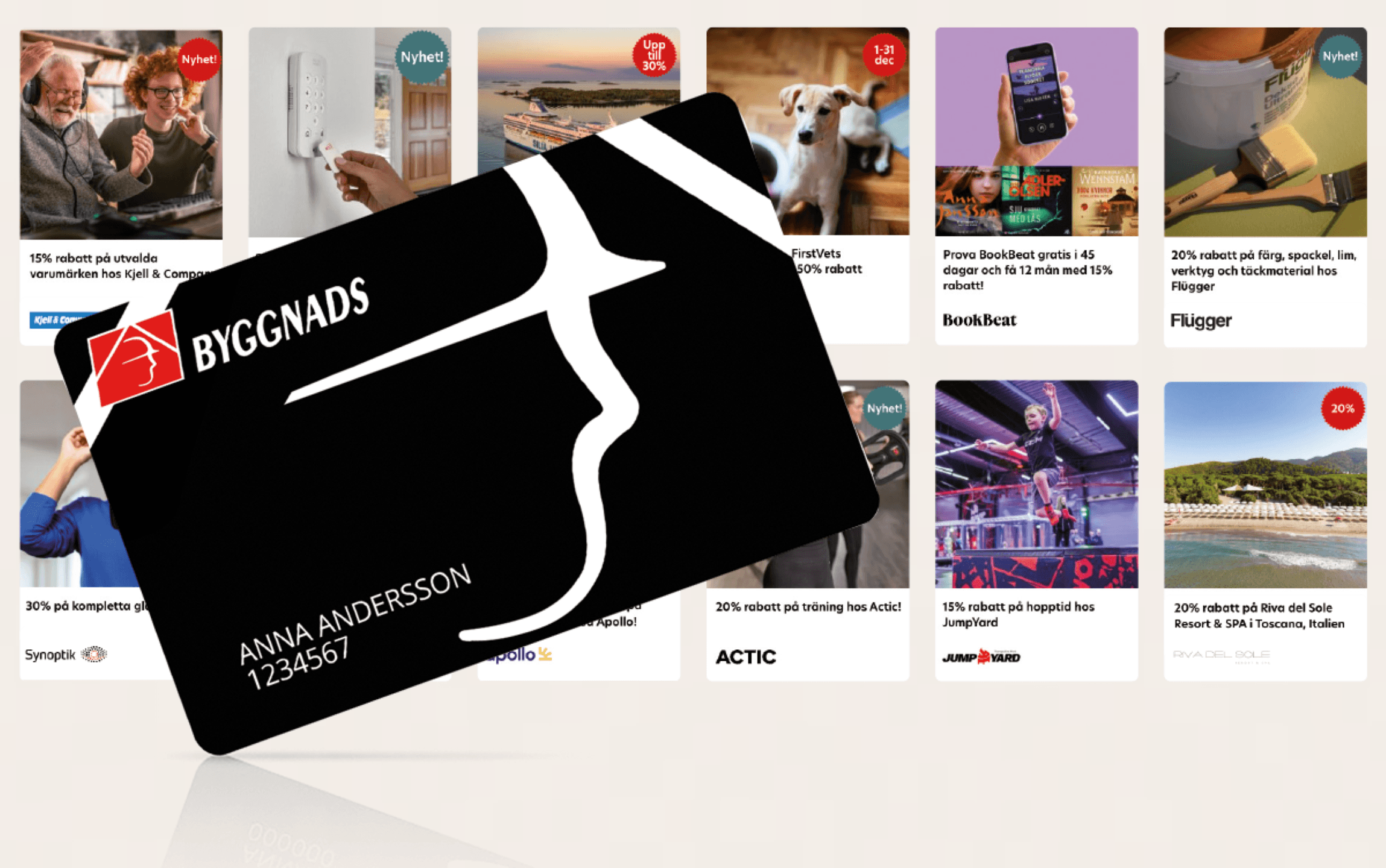 Byggnadskortet är laddat med rabatter och erbjudanden från Actic, Apollo, Carglass, Flügger, Kjell & Company, Jump Yard och många fler. Upptäck dina extra förmåner som medlem.